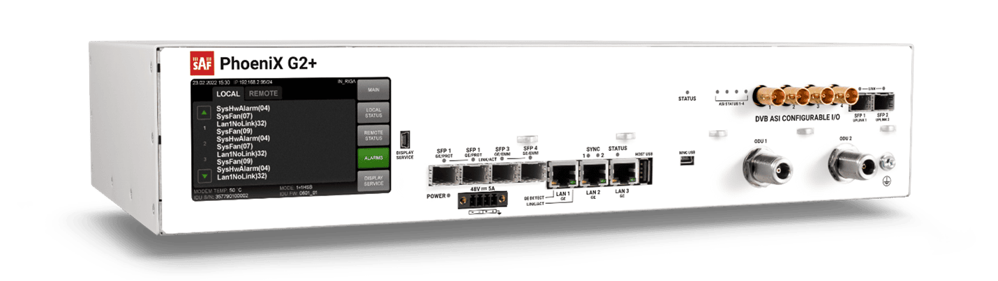 The SAF PhoeniX G2+ is the latest full indoor solution for Broadcast Applications. The SAF G2+ is a flexible, modular wireless system transporting IP with native ASI and TDM data, which is ideally suited for ATSC 1.0 today and ATSC 3.0 in the future. The SAF G2+ features a touch-sensitive LCD control panel for quick and easy critical parameter monitoring. We offer fully redundant system configurations for protecting every component. More information is available from the PhoeniX Series Datasheet.